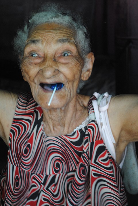 Over the next few weeks I would see Colossa from time to time and smile at her or say hello…until finally our final day in the Dominican Republic we had an opportunity to visit her again. My team had purchased a ridiculously large bag of candy to share with our kiddos and neighborhood friends. Everyone was running wild – strung out on sugar and sheer excitement. Blue tongues, green tongues, red tongues and such — were all around us – making the whole event quite comical. Walking by Colossa’s house, I watched her smiling at the kiddos and wondered to myself, “I wonder if she would eat a lollipop?” Without hesitating, I asked her, “Would you like one?” Eyes wide and a childish grin erupted immediately as she responded with a nod of the head. I ran across the street to retrieve a treat for her and returned with two blue raspberry suckers. Opening one I placed it in her mouth and watched as sheer delight flooded her entire face. She shook with joy and giggled as she closed her eyes and savored the taste.