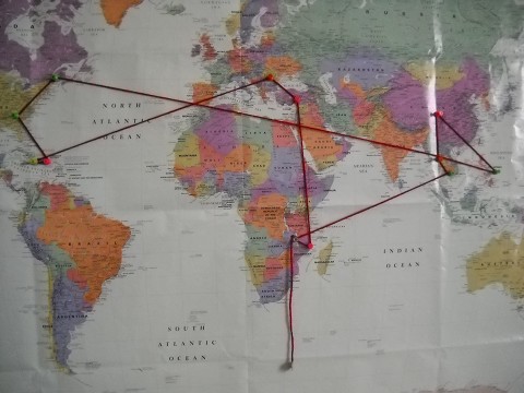 The map on my bedroom wall, now showing some of the places my JULY team will be traveling to!