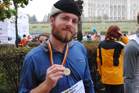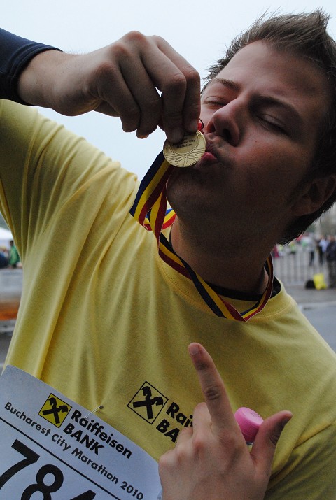 (Miscellaneous Romanian man finishing his marathon + getting his sweet medal…He did it “Just for Fun”.)