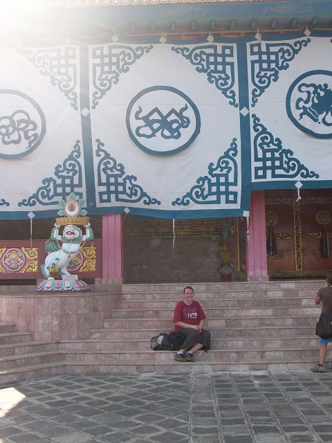 When we finally got to the top, it was an amazing view. We could see the whole town below us and the monastery looked like a smaller version of the white house. Huge white pillars at the top of the stairs hid the elaborate paintings and sculptures of the buddhist fairy tales over the ceilings and walls of the entrance way. The surrounding grounds were covered in golf course quality grass with manicured shrubs and flower beds. The garden was quite shocking because we have not seen anything landscaped since Europe.