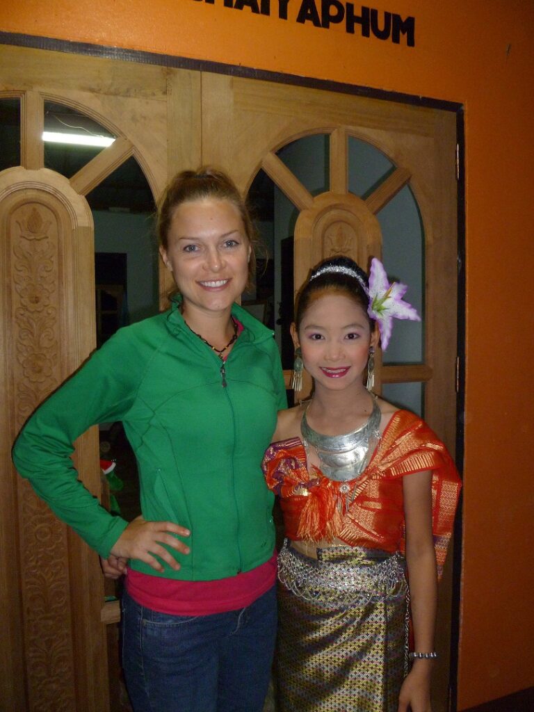 Once we settled back in at home, the neighborhood kids began showing up for our daily evening of Uno games, soccer, coloring, and English. Many of the children who come, including Fern (who accompanies us to church and speaks English very well for a child of 12…and is pictured above after performing a traditional Thai dance for us), live with grandparents or relatives because their parents have traveled elsewhere to find work. They are always starving for attention and thrilled to receive so much of it from the crazy American girls. Our evening with them ended (as it always does) with a series of at least 2 hugs from each child and promises to continue our tradition tomorrow. As they hesitantly left, we again reminded each one how much we love them and how beautiful ( Suai in Thai) they are. I wish a part of me could remain here just to continue to hug them every day, but I am thankful to God for letting me a small part of the blessings that are to come to Chaiyaphum.