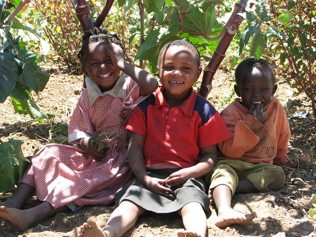 phrases he knew… “Kuja hapa!� (come here). Three young kids rounded the corner