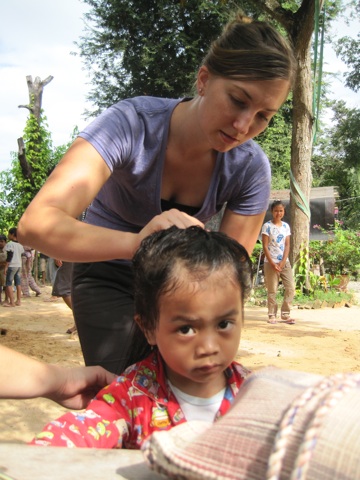 In the village, we teach them about a bible story, play songs and games and then we do some hygiene stuff like clipping nails and washing hair. I love clipping the nails!!