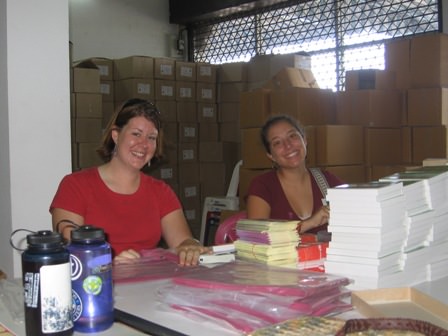 Christy and Brady put labels on the DVD cases             Heather and Elizabeth putting together the packets