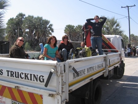 So we saw this flat bed truck drive up and we asked the driver if he was going to the border and would he mind if we hitched a ride in the back.