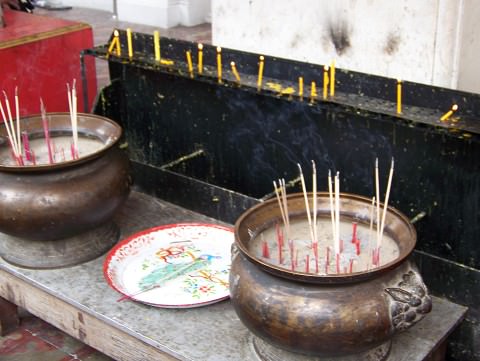 People go to the temple to build their ‘merit’ by bowing, whying, and giving offerings of flowers, coins, candles, and incense sticks.