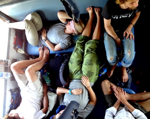 Thankfully for us.. We sat up post right in front of this room where Beka and Trey made friends with the guys with their sweet Ukulele skills.. And we had 2 of the guys from the orphanage come with us. It didn’t take us long to realize that we were the ONLY westerns and ONLY tourists in the train. We looked around and seemed like there were at least 200 eyes on us. WOW All I could do was look at my team and laugh.. I guess we didn’t look as bad as we thought? Ha Not more that a few minutes later this group of 3 guys that have been staring straight at me pull our their cell phone and are trying to take pictures of me from a distance.. So I smiled and posed- DUH! They laughed and came closer and I said hi..