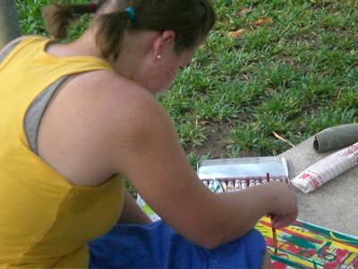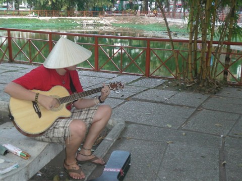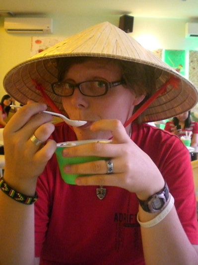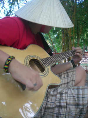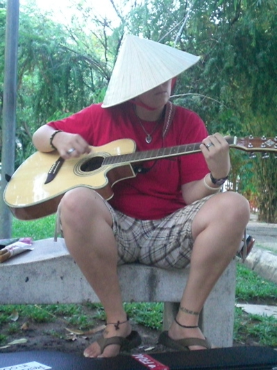 I decided to call Lauren, you know, for company. The two of us head out when I get this amazing idea, “Hey, wouldn’t it be awesome if I got one of those Asian hats and then just sat under the tree playing my guitar?” Oh yea! We head towards the park, keeping our eyes peeled for a hat. We decide to stop for snacks at the bakery before beginning our adventure. While there, Lauren realizes how much more amazing this whole day would be if she had her paints. “Let’s go get them,” I say. So we do. And on the way back we buy my hat.