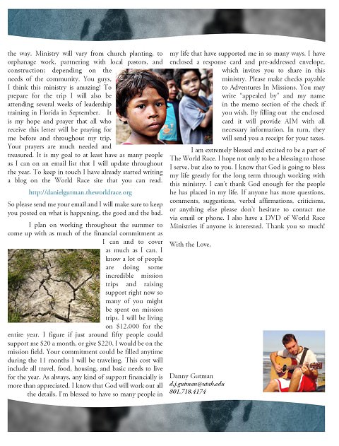 So here is copy of my support letter that went out a little more than a week ago. Sometimes when i think of raising support I feel sick. Its so against my nature to ask for money. But I also think that even writing the letters and telling people what you are doing is invaluable. There is nothing like raising support that makes you realize just how blessed you are and how many unique people God has placed in your life. God giving me a community that truely is incredible to me. Probably the hardest thing about this race will be leaving everyone. Though its just a year, so much growth and new relationships seem to happen almost every year. Pretty much all I can really say to my friends and community is thank you… you have been a huge part in helping me find who God made me to be… you dominate.