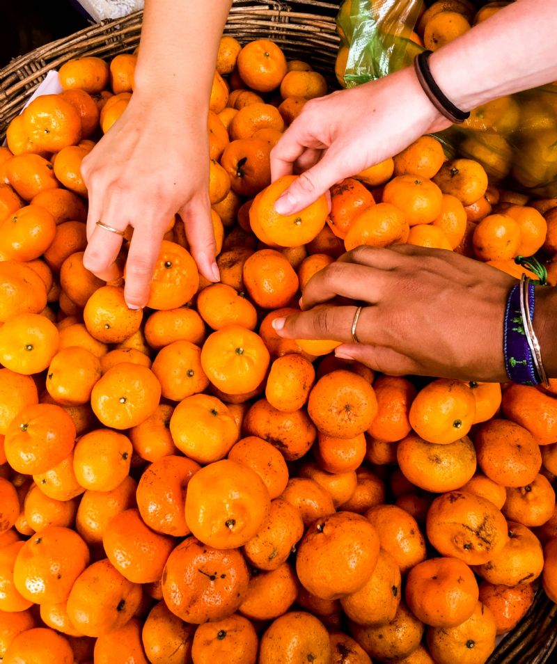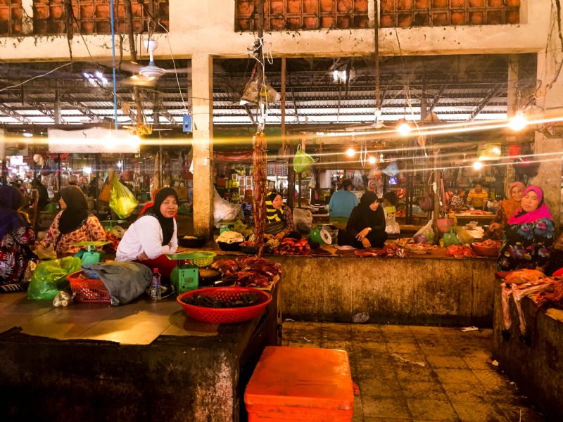 (Here is the meat section of the market. Rows and rows of women selling meat, with the occasional head or hooves sticking into the aisle.)
