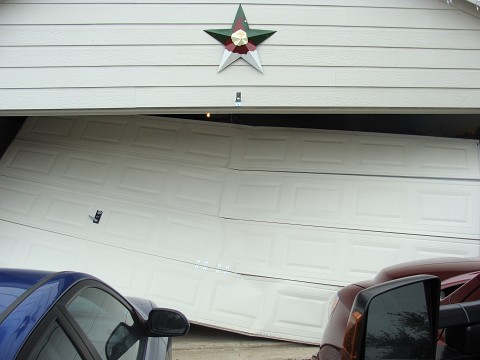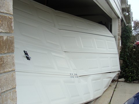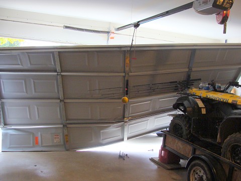 The garage door handle got caught on my license plate (because my car was too close) and it resulted in the garage door folding in on itself while violently spitting out the round “things” that kept it on the track!!