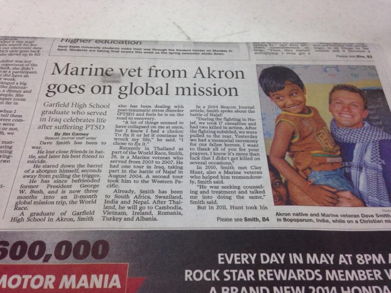 I was asked by an editor from my hometown newspaper to do an interview about my time in the Marines, experiences after,my connection to president George W. Bush, and what led me to the World Race. It showed up on the front page of our “ENJOY!” section. The article can be found here: http://enjoy.ohio.com/marine-veteran-from-akron-goes-on-global-mission-1.485974