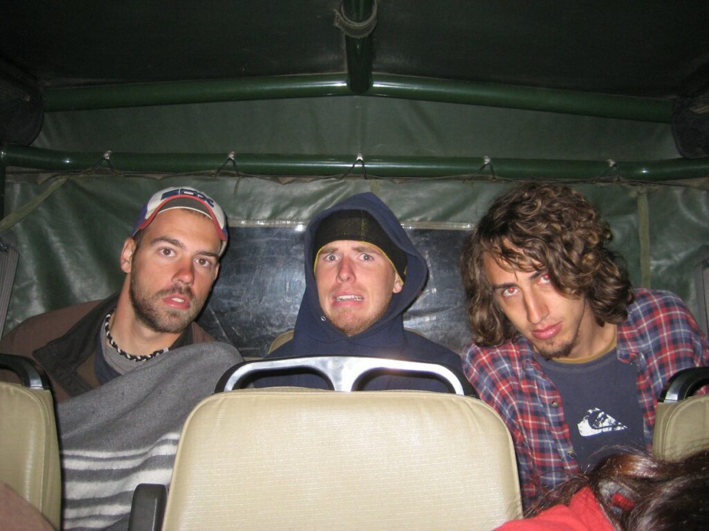 Dave, Me,and Zach were the back row, and I do have to say that we are pretty hilarious… anyways, one special unexpected addition to our trip was when we were cruising down the dirt trail, and a bird flew into the vehicle into zach’s face. ps this photo was taken at about 5.30 in the morning, hence the lack of expression in dave and zach, and my fear.