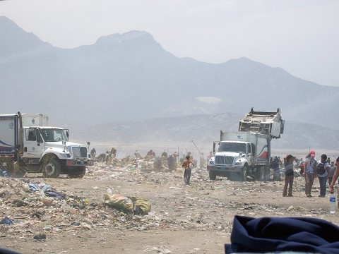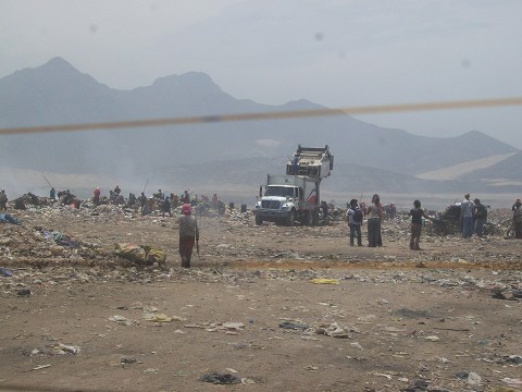 As we head up the hill we see swarms of head lamps of people who have already been awake and working! While we park the moto taxi we are greeted by a pack of dogs who live in the dump. chi chi tells us that we need to wait about 20 minutes for the next dump truck to arrive. Sure enough the dump truck arrives and we walk towards the dump truck, with 20 or so other people. chi chi and the other locals use these long poles that have 2 prongs at the end of it to pull the garbage bags off of the truck. After the bags are off the truck we begin our hunt for treasures. One by one we grab a bag, tear it open and search for food, paper, plastics bags, plastic bottles, glass bottles, electronics, and anything that could be recyclables. As we find food items we place them in a large potato sack while all the other items are piled on to a tarp. After we have finished picking thru a section of the garbage we tie the bags up and bring them back to the moto taxi.