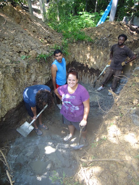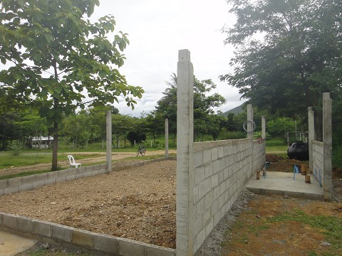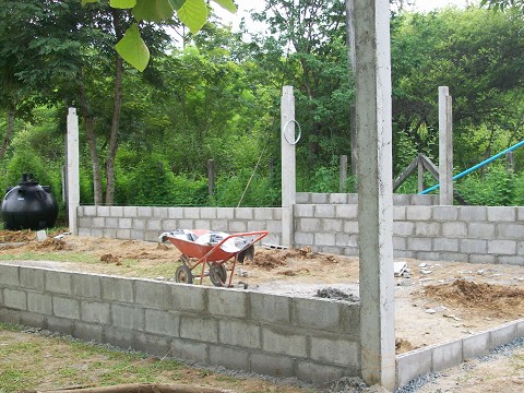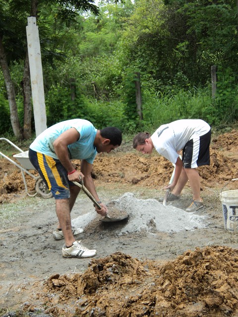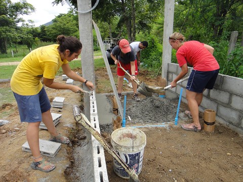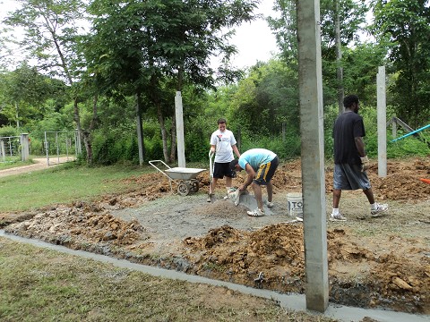 A majority of our ministry this month was building a house for future teams to stay in while they are at Remember Nhu. When we first arrived I was very excited to know that there was going to be manual labor!!! My body, though, was not entirely ready for 4 full days of construction a week. After this month I feel like I can really expand my resume. We dug footings between all the pole that had already been set, unbent 20 foot long re barb hair pin things, cut re barb, mixed (by hand, well technically by shovel) many man bags of cement, split cement bricks, set concrete & bricks in the footings, mixed mortar, laid bricks, dug trenches for the plumbing, set two corner poles for the bathroom, painted the steel pieces for the roof to prevent rusting, laid gravel for the floor and set a layer of concrete to re level the walls after 6 layers. Let me tell you that is has been a heck of a month! So, while you sit there in your comfortable computer chair, in a comfortable temperature and relax you can look at some pictures of us working our butts off 🙂