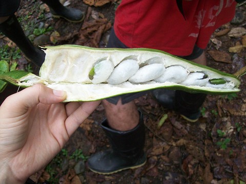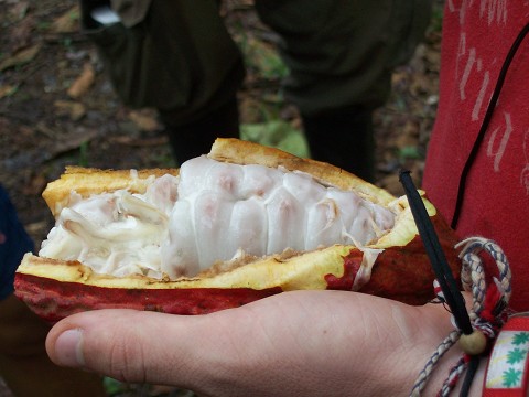 This is cacao – what chocolate is made from. You can eat the white stuff off of the bean. It tastes like a jolly rancher.