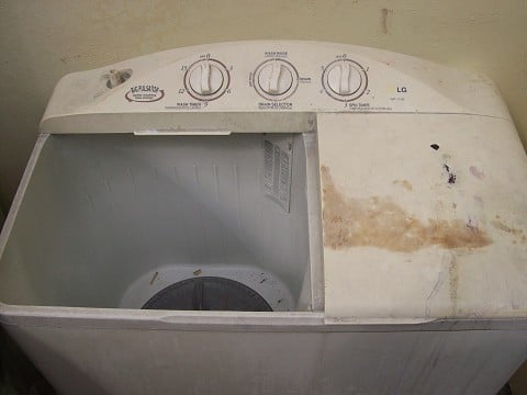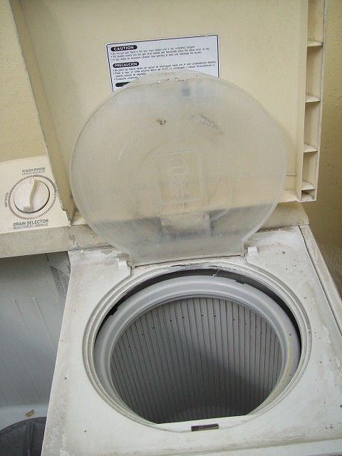 Step 6: After 15 minutes turn the middle dial from “wash” to “drain”. All the water will now run out the bottom of the machine (on your feet) and it’s black nasty water.
