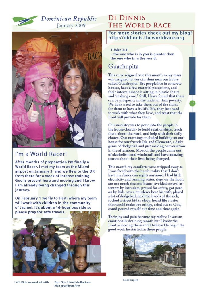 I can’t believe I’m finished my first month on the World Race and I’ve already had tons of experiences that are shaping me. I have attached my newsletter from the Dominican Republic. I had a great month and the relationships I built with the people in the slum of Guachupita are ones that I will cherish for a while.