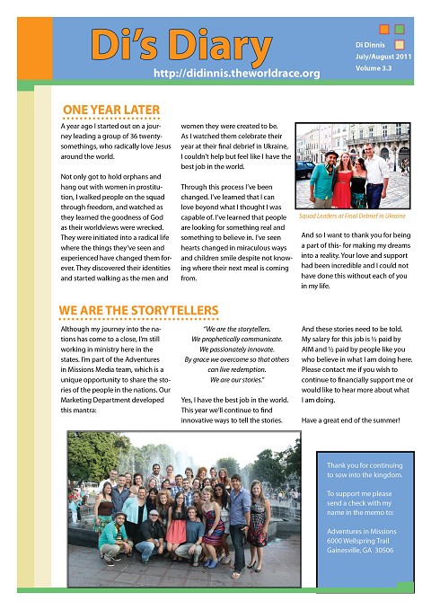 Sorry that it's been so long since I've been in communication. It's been an adventurous summer filled with trips to India and Ukraine, training camps and many hours in the media department. You can read more about it in my attached newsletter.