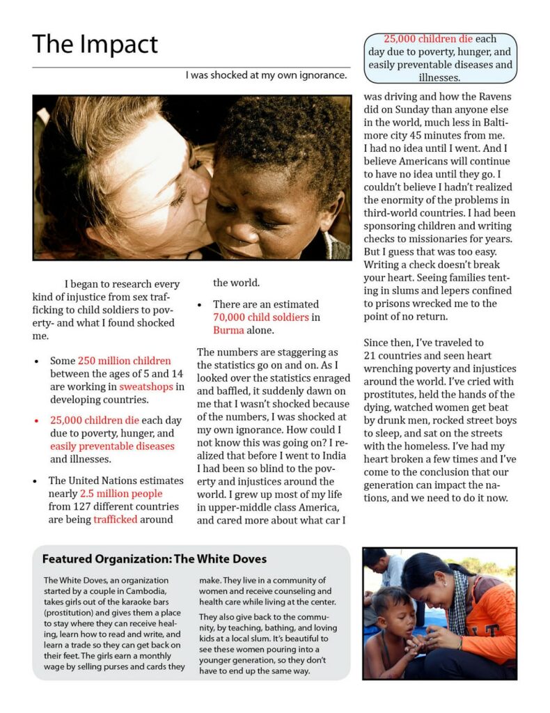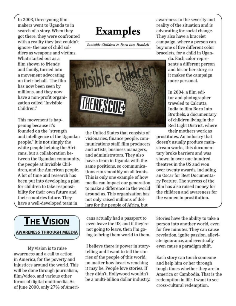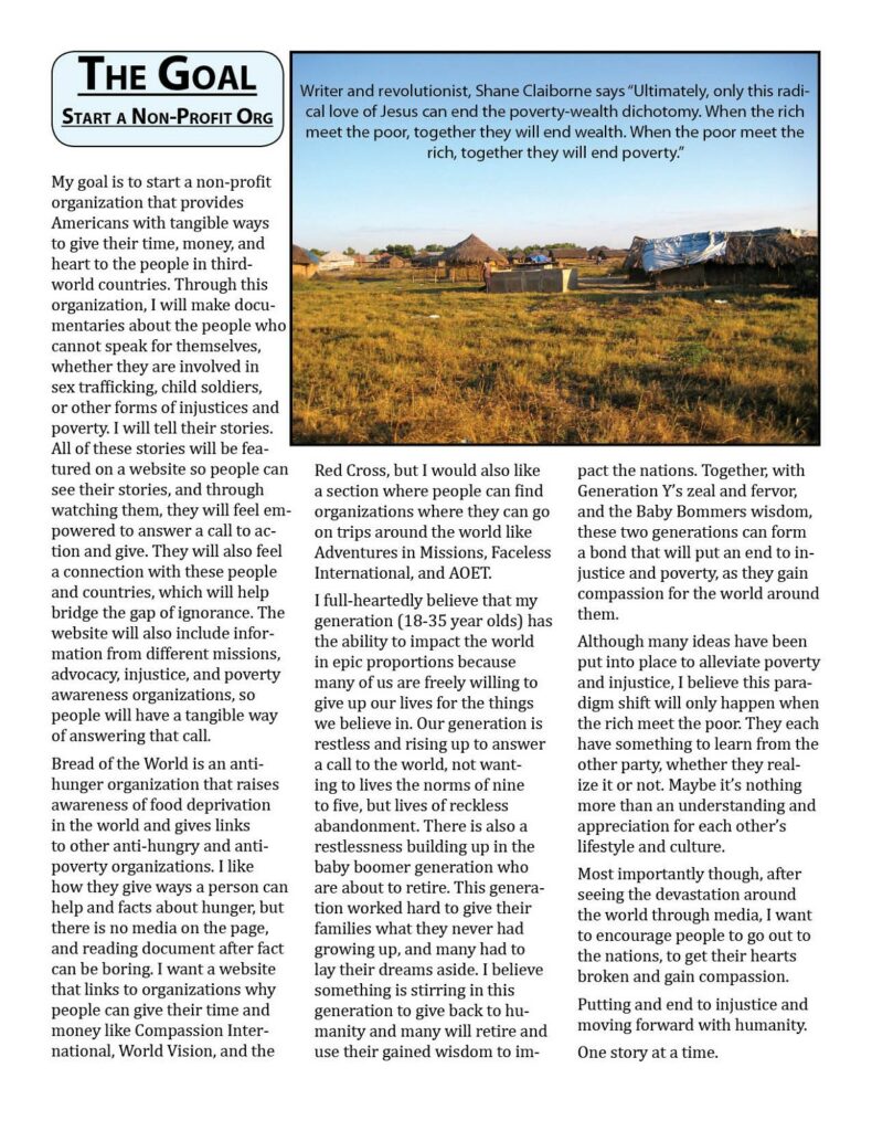 This semester at G42 we have been learning a lot about leadership and vision. Leaders cannot be effective unless they know how to cast vision, and so Dave Hearn has challenged us (and assigned us) to ask God for our vision and write it out. We will also have to present our vision (with multimedia) to the class next week. Our vision projects include our dream/vision, how we got there, other organizations (good and bad) who are already doing what we want to do, and how we plan to execute our vision.