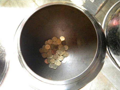 When the Buddhist people of Bangkok toss coins in these metal buckets at the temple they make a clinking noise so everyone can know that you gave some money.