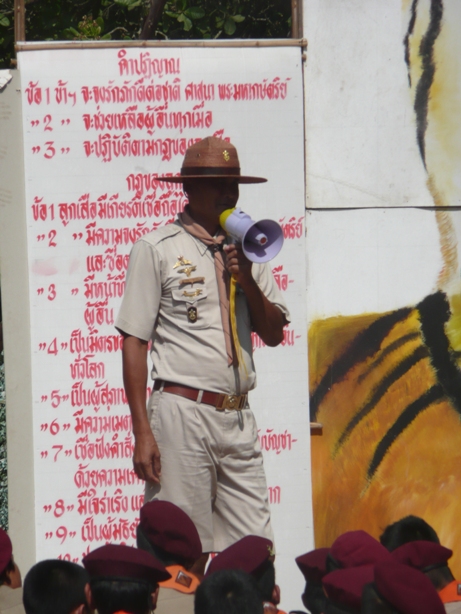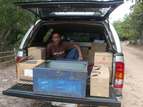 We get out of the truck, and begin handing bibles to all of the uniformed teachers, who greet us kindly, and thank us. We converse in broken Thai, Khmer, and English. Another uniformed gentleman directs us to where the children are, seated in rows, and awaiting orders. We hand out boxes and boxes of Bibles, and are taken to the next group of children, where we hand out more Bibles until we run out.