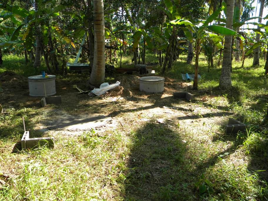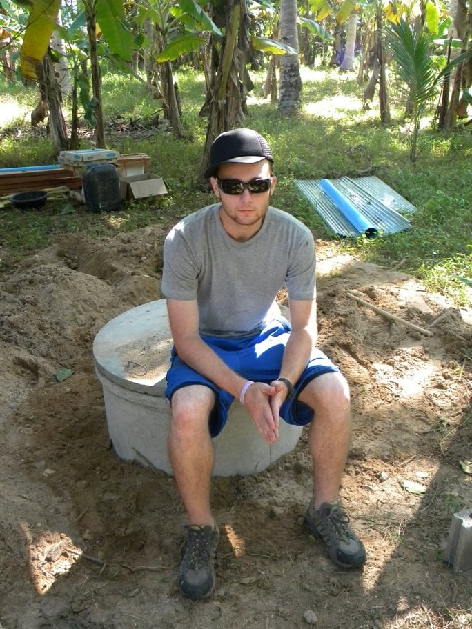 to use for the toilets. We began by digging two 6ft deep holes that would hold the concrete tanks that we then pieced together. Next, we leveled the land for the foundation of the “toilet-house” and built a 2 ft concrete base around it to elevate the structure in case of flooding. We then handed it off to another group of guys who built the wooden hut, and ran the piping from the toilets to our tanks.