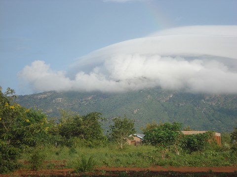 Early-morning clouds roll over the mountain. If you look hard, you can see a faint rainbow.