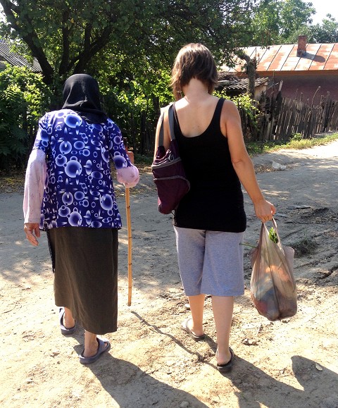 On the way there, Julia spots an elderly woman walking with a cane and what appears to be a very large bag of groceries. In this moment, we both knew we could not go on with our normal day without helping this woman carry her groceries home. We were desperately trying to explain to her that we wanted to help her (via our best charades), when a Romanian woman walking by was able to speak enough English and Romania to tell the woman we just wanted to carry the bag for her. Sure enough, as I took the bag I realized that it was at least 12 lbs. Did I mention that it is about 80degrees at this point and the sun is relentless? I really don’t know how this little old woman was going to be able to do this today. She was wearing at least 5 layers of hot clothing and she could barely walk as it is.