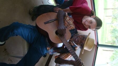 When the service was finished we got to continue fellowshipping with them. We were entertained for over a half an hour by two very special men. Stanley is only 48 but confined to a wheelchair after a car accident and a stroke. Due to the stroke his speech is impaired and he uses basic finger spelling to get out some words. The other man was a relative of his named Allen. When Allen arrived (late) he brought with him his guitar and his straw hat. He loved to play his guitar and sing, regardless of the fact that he didn’t have any teeth. His face lit up as he sang his favorite hymns keeping rhythm with his guitar.