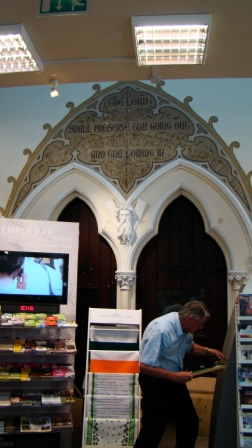 As I walked through the doors I was about to start tossing some tables. They had turned this magnificent house of prayer into a tourist center. Instead of coming to pray, fellowship with believers, and learn about God, you could schedule bus tours, by liquor and shot glasses, calendars, leprechaun toys, etc. The inside had been renovated and looked as modern on the inside as it was old on the outside. They did leave a couple of the massive doors and stain-glassed windows, and an inscription over one door that caught my attention.
