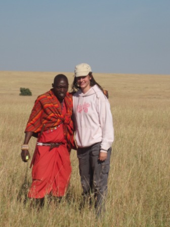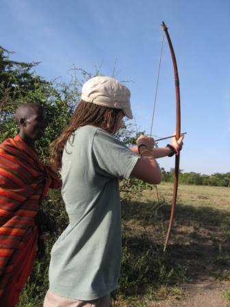 We arrived to Ntayia and Kios’ house in the early afternoon and after putting our things down headed out for our walking safari. When you live where these brothers live all you have to do is walk out the back gate of your village compound and you are on a safari. These men have to be able to kill and butcher a goat by the age of 8, and to be called a man must kill a lion and be circumcised without wincing. These tasks are usually accomplished by the age of 14. Kios has a scar under an eye from a lion, and another guy, Dennis, has one on his shoulder. When they reach about 13 they are sent out into the wilderness in groups of the boys that age and they cannot return home until each one has killed a lion. Ntayia was in a group in which one of the boys was killed by a lion. His group was also away from home for almost two years before able to return home. For our protection we went out later in the day when the King of the Jungle is sleeping already and our guides brought their bow and arrows that were poison-tipped. The walk was beautiful. The vast openness was endless. We saw zebras, Thompson gazelles, jackals, and wildebeest. We each also got to practice our archery skills. Perhaps I will take that up as a hobby when I return home.