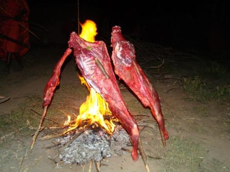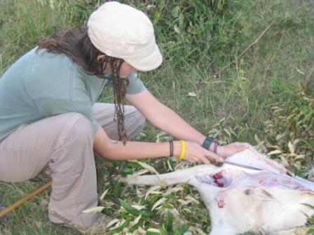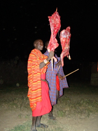 We got back to the village as the sun was beginning to set. We still had to prepare dinner…but what’s on the menu? GOAT! We went out into the field, chose a goat, and watched Francis catch and suffocate him. His name was Oliver. The Masai warriors drink the blood and are, for the most part, peaceful/humane people and thus the suffocation. So the goat’s dead now what? This is the part when everyone else from our group walked away, except me and Caitlin. We were able to assist in the butchering of little Oliver. Yes, I can now say I have butchered a goat in the middle of the Masai Mara. Two things made me nervous, when the nerves made his heart twitch (as I’m cutting away his skin) and secondly, when they rolled him over the air left inside came out and Oliver made a bleating sound. Caitlin and I both jumped back in fear on that one….then started cracking up. The meat was put on sticks and placed over the fire which was started by rubbing two sticks together.