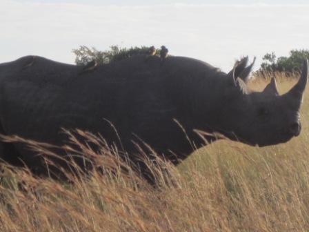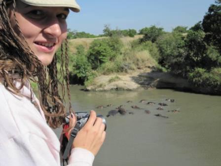 5:30am, my alarm went off and it was time to head off to the driving safari in the park. We got dressed to the sound of hyenas laughing off in the distance. On our drive to the park the sun began to rise. We had just enough light to spot some elephants by the side of the road. I saw three and they were hiding amongst the trees. Check one of the big five off the list, and the sun hasn’t come above the horizon yet. We had barely entered the National Park when Kios spotted what looked like a bush to us, but as it walked closer we saw that it was a Black Rhino. He came up very close because he was trying to cross but we were in the way. Just around the corner was our third of the five, a herd of buffalo. Elephants, rhinos, and buffalo, what a way to start off the day. As we drove on we saw many other animals: Wildebeest, zebra, warthog, ostrich, hyena, antelope, jackals, topes, giraffes, vultures, crocodiles, etc. The last two big ones we saw were the hippos and last but not least the lion. We first saw a female lion just off the road in some grass. She had recently killed a zebra and was resting before she began her feast. Towards the end of the drive we saw a male lion. He also had a freshly killed zebra which we saw him pull back into the trees as we drove up. What an awesome animal. They are so strong and huge. He pulled the zebra in his mouth like it was tiny.
