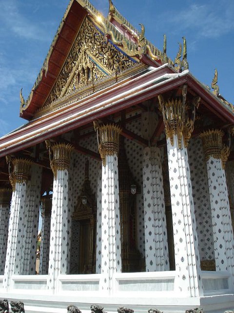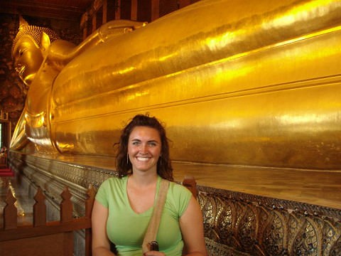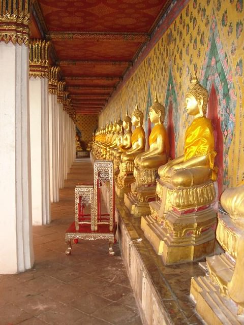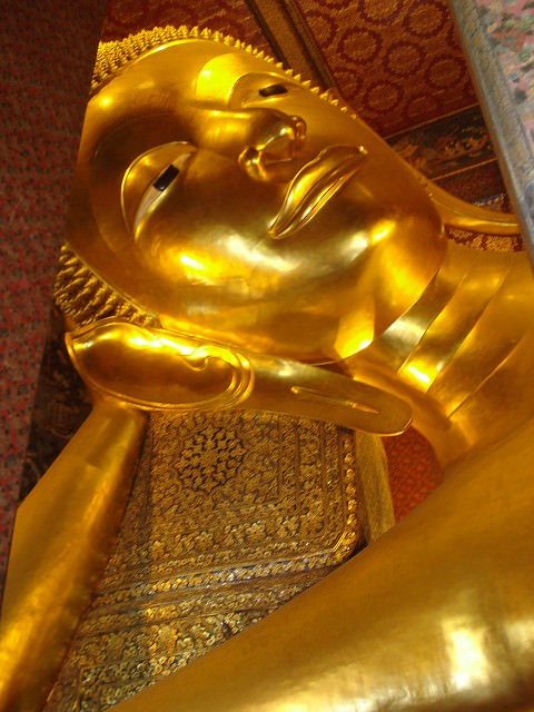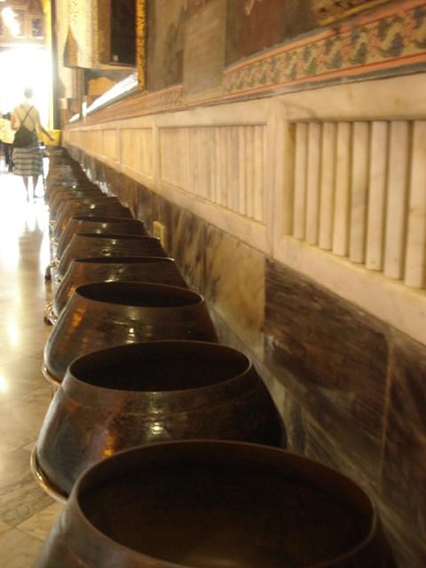 We hopped back on the boat crossed the river and went to Wat Po (Temple of the Reclining Buddha).  We had to take our shoes off before going in the temple as a sign of respect.  Inside the temple lays a giant 46 meter long gold covered buddha resting on its side representing its pass into nirvana.  There was also a line of 108 pots where people place money to gain merit.