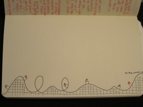 But I’m going back up. On a new coaster, never been ridden before. By myself. I’m tick-tick-ticking to the top and I don’t know what’s coming after the drop. As I look back at the platform, my friends and family are standing there waving goodbye to me. They’ll be at the platform when I get back but they won’t experience all the loops and turns they next year has for me. This makes me sad.
