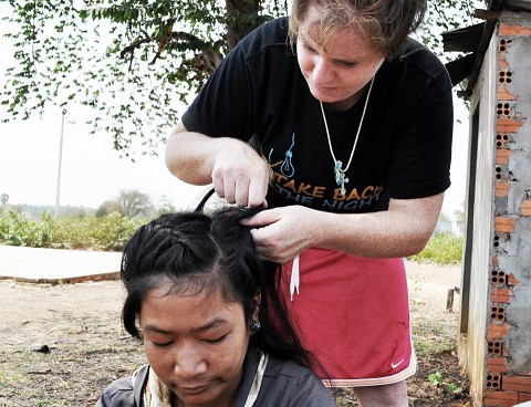 Braiding a teenage girls hair in “42 Village”