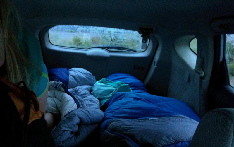 Fortunately, we were able to easily fit all of our gear in the two front seats and then fold down the rear seats of my Nissan Rogue so we had a fairly spacious sleeping space.