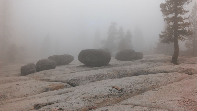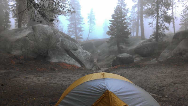After we arrived at our campsite in Tamarack Flats, we set up our tent. The fog was thick and made everything look mysteriously beautiful.
