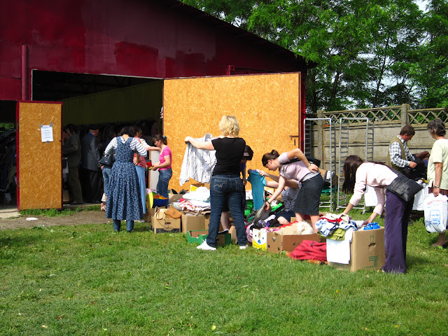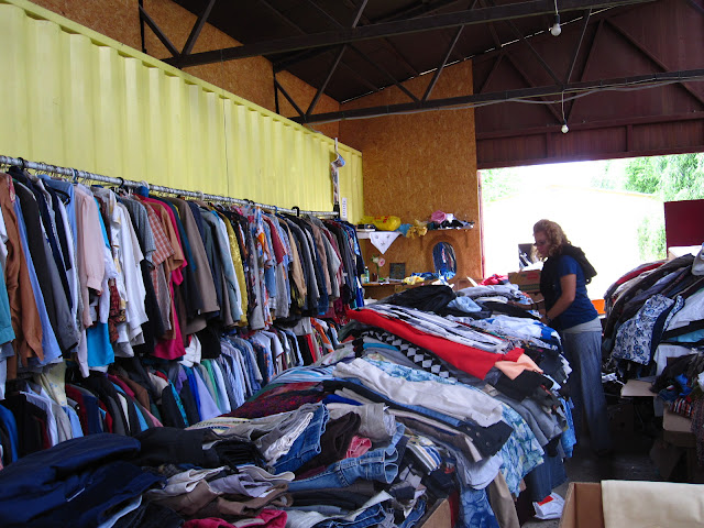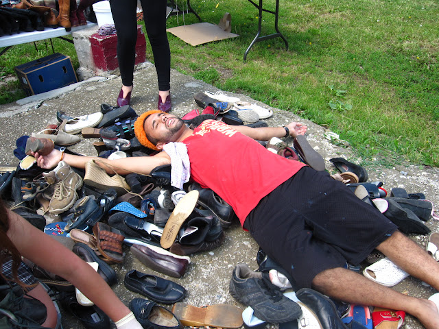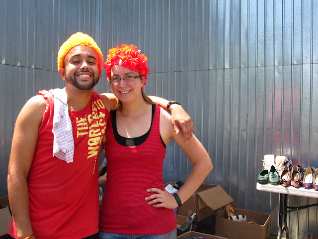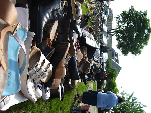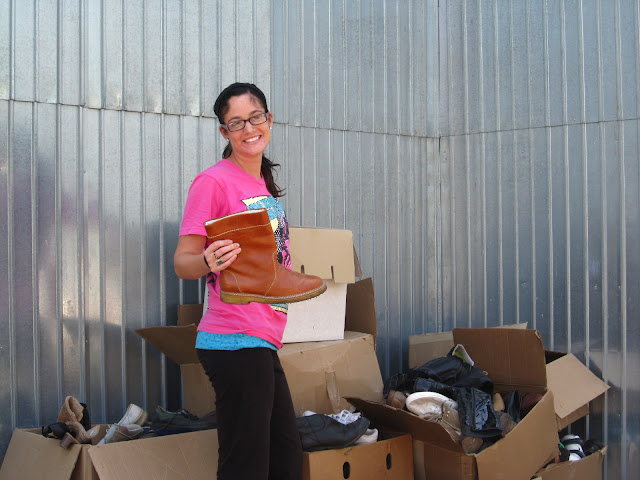On Thursday, we begin to set things up outside. And we were in charge of setting up the shoes, which meant that we had to find the shoes that belonged together to make pairs. It is not as bad as it seems sorting through about 20 boxes of shoes in all shapes and colors.