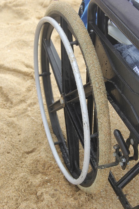James, another volunteer, wheeled Bradley across the sandy shore and parked him with the group. When everyone else was touching the water Bradley was not left out., James brought up