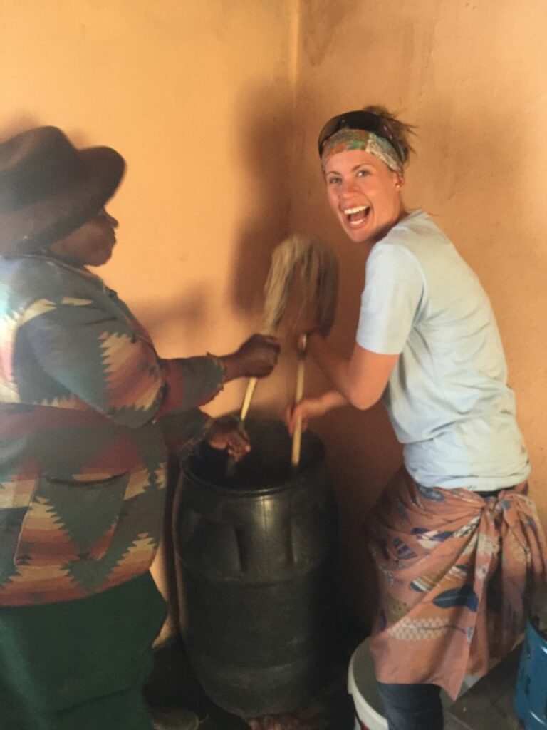 So day one, we head into the village with no idea what we are actually doing. Teboho leads us to the first house at the top of the village and we head down the driveway like a bunch of confused, nervous and excited white girl tourists in skirts… Except for me, I was in jeans with a scarf wrapped around my waist cause we all know I don’t prefer skirts. We were eagerly met by a group of women who were busy doing some sort of task. We introduced ourselves by name, age and country of origin, and asked if we could join them or help them with any of their daily tasks. And BAM, it was game on! Turns out they were preparing for a village wide party that coming weekend and they needed to make what seemed like about 30 gallons of traditional Basotho beer. So we became a brewery crew! We started fetching firewood and water, built a fire, boiled a huge cauldron of water over the fire, mixed up a bunch of water and grains in a basin, combined this paste with the boiling water, and spent the next hour stirring the concoction with a big stick and the handle of a dirty old mop. Day one success!We visited a few other houses that morning and all walked home with smiles on our faces.
