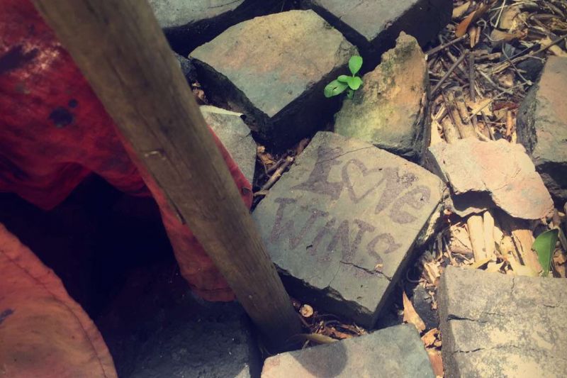 So today, I went to a trail. I heard about it through Facebook, and saw it was close to where I lived. The pictures I saw were not very pleasant. There were a bunch of pictures of creepy doll heads, visibly aged by weather and time. Most would probably be too creeped out to even go. However, for some reason this trail intrigued me and I wanted to go. When I get to where the trail is, I am shocked of what was there. The artwork there was simply garbage that people took and made something artistic out of it; essentially creating something completely new out of discarded, filthy, items. At one point, I came across a fragment of a broken rock, which said “Love wins”. It was in the middle of some dirt, surrounded by the rest of the garbage, the art. Something about this particular quote stuck with me. I started to think, and it wasn’t until I got home that God revealed to me something amazing through this scene. Love wins. Of course that was what was put on the rock, but it really does win.