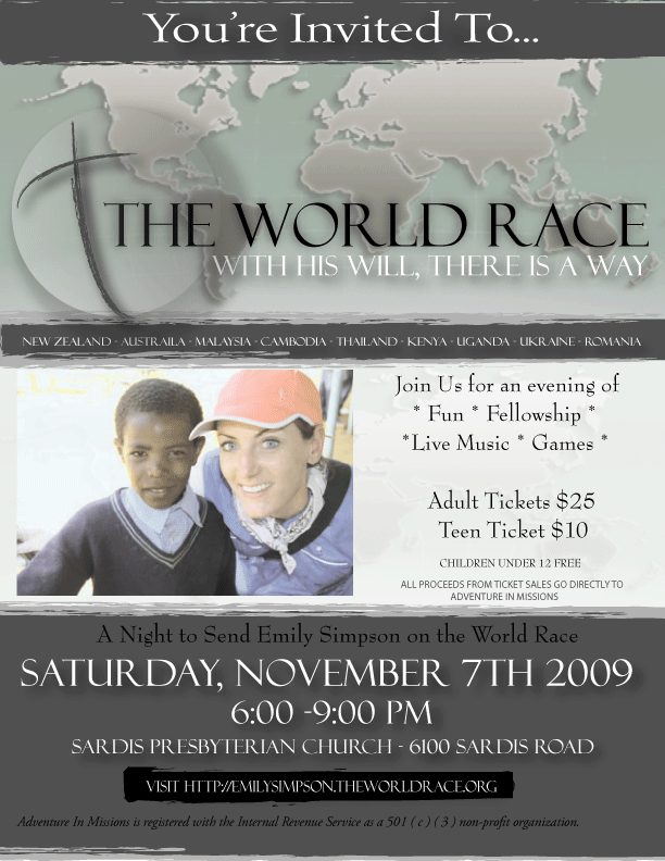 For the last twenty years, Adventures In Mission has been sending missionaries all over the world. The World Race trip I am starting in January 2010 will send me to New Zealand, Australia, Malaysia, Thailand, Cambodia, Kenya, Uganda, Romania, Ukraine and two other countries to be chosen later in the year based on need.