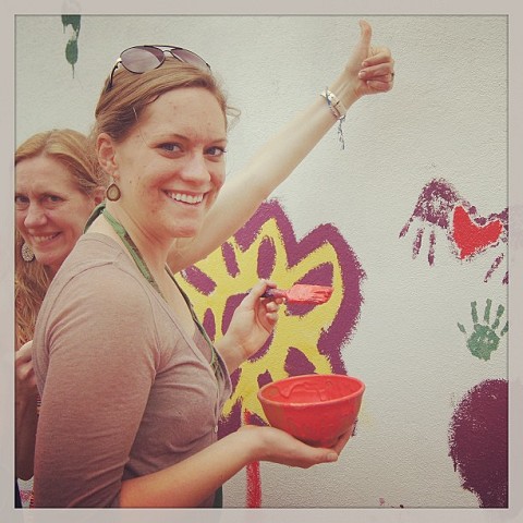 Paso a Paso (step by step), which gives them a decent meal and love after school in an impoverished village outside of Antigua. Like the splashes of paint on our T-shirts, we got to paint “graffiti” on a wall at the center. I will never forget helping those kids paint that mural. There was such Joy! All afternoon, the varied gifts of parents and racers came out: some played sports with the kids, some held the babies, some headed straight for the classrooms, others helped with the food prep and clean-up. My favorite part of that day, though, was watching Jamal entertain the children with a song that involved squatting and standing and hollering and whispering. They fell in love with him, and it