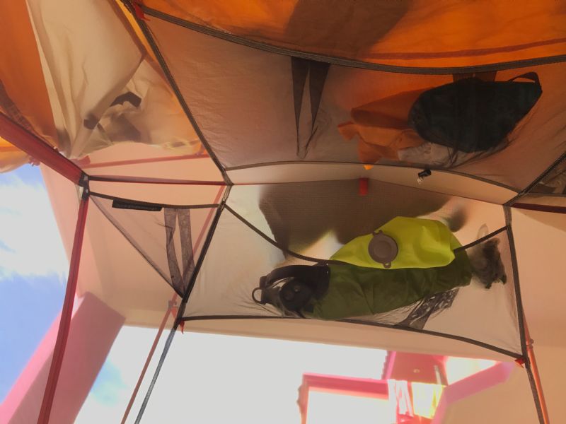 - Above my head I keep the bags that stow away everything when I am done for a quick packing process. I also keep my head lamp up there. This helps me find my things at night, journal, read, or take medication. Here is one like mine -> https://www.rei.com/product/109857/petzl-tactikka-core-headlamp