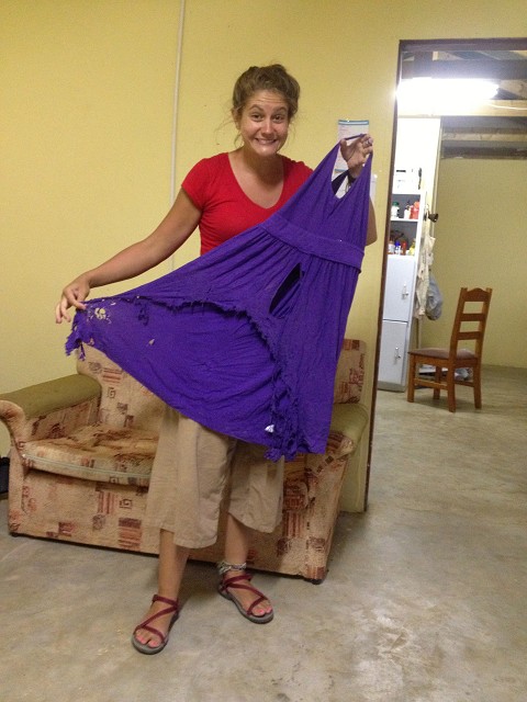 I began inspecting my clothing as I pulled it off the line (as well as a few items I had carefully placed between the barbs of the fence). Cow slobber was coating my gray leggings, orange quick dry shirt, the sleeves of my long sleeve shirt and the left leg of my yoga pants… yum. Other clothes had been yanked around the barbed wire, but I have a sewing kit. I didn’t think my clothes inside of the fence were within snacking reach, so I went inside to tell my teammates and rinse off the cow slobber.