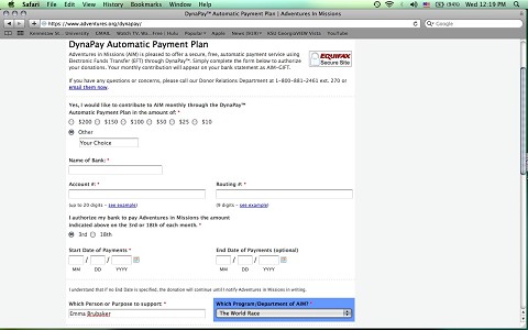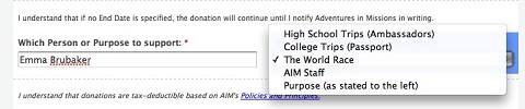 Please make sure to put my name as the person you want to support and scroll to the program/department option for “The World Race” as seen below. (Please and Thank you).