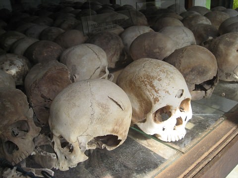 Each rain brings more.  We were startled to see a jar of teeth in a glass box in a field full of holes.  You can only imagine our reaction when we noticed more teeth lying at our feet underneath the box.  We walked on through this place, where bones and clothing recently unearthed by mother nature appeared to belong, to be normal.  The workers seemed to be more occupied with keeping the grass free of fallen palm tree branches than human remains.  “Tree to kill babies and small children” one sign pointed out, as our guide motioned in a baseball swing fashion towards the tree.  Another tree marked “Held speaker system played loudly to cover moans.”  “Mass grave of 166 victims…without heads.” also found its place in these horrific grounds near Phnom Pehn, Cambodia.  Needless to say, the car ride home was rather quiet.
