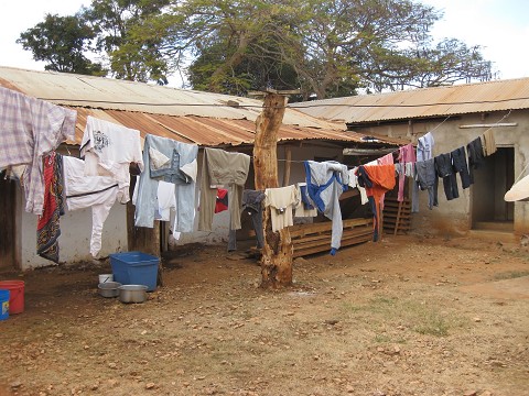 our home in the village outside the church in our African skirts